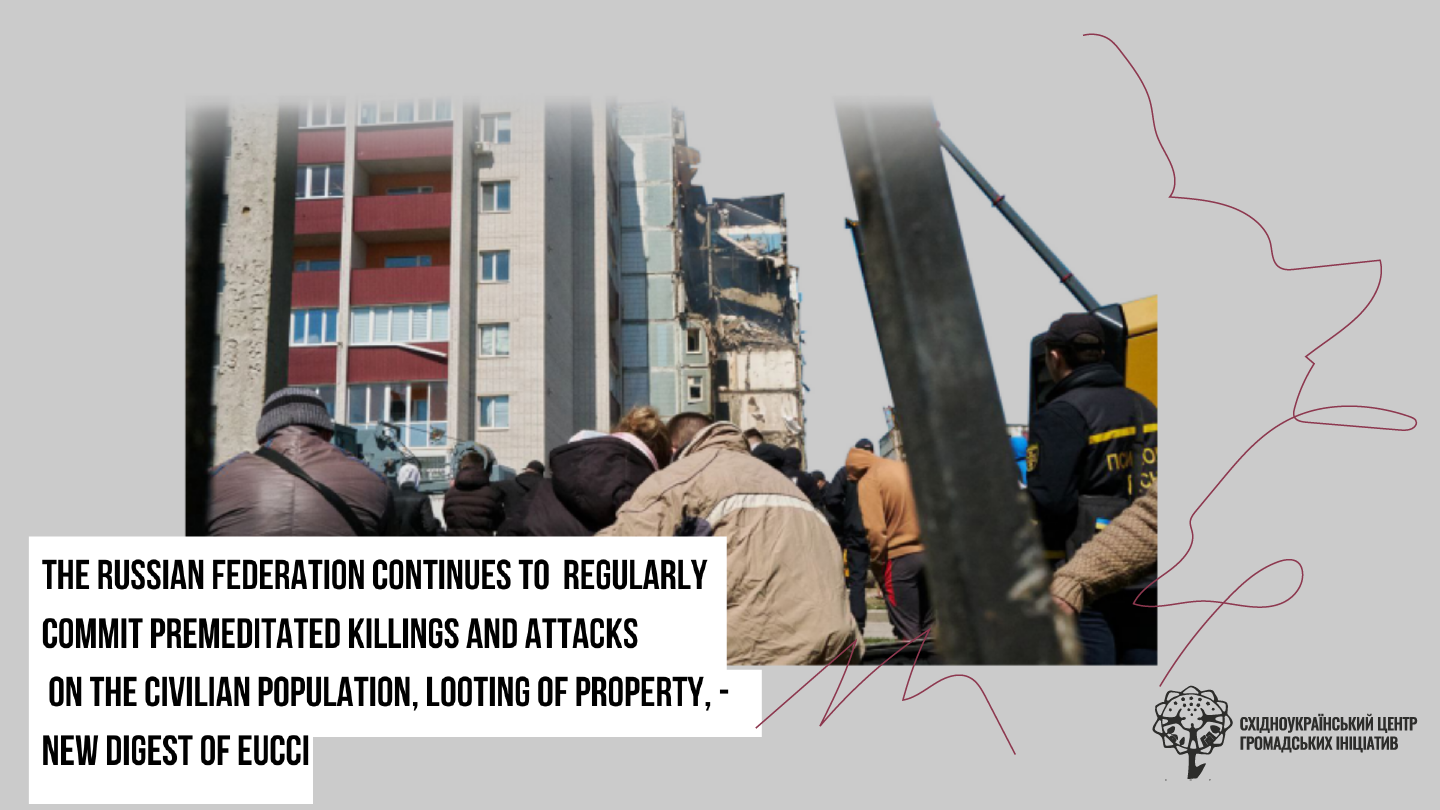 Since the beginning of the full-scale invasion of the Russian Federation, the Eastern Ukrainian Center for Civic Initiatives (EUCCI) has regularly recorded cases of premeditated killings, attacks on the civilian population, sexual violence, threats to high-risk structures and facilities, and looting of property. This practice continued in the period from February 24, 2023 to May 31, 2023. Violations of international humanitarian law during this period are summarized in the new EUCCI digest.