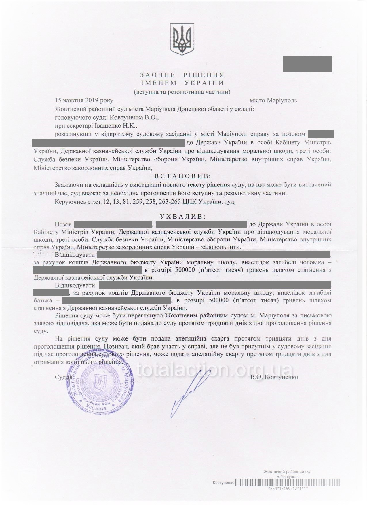 «Відшкодувати […]* за рахунок коштів Державного бюджету України моральну шкоду, внаслідок загибелі чоловіка – […] в розмірі 500 000 гривень шляхом стягнення з Державної казначейської служби України. Відшкодувати […] за рахунок коштів Державного бюджету України моральну шкоду, внаслідок загибелі батька – […], в розмірі 500 000 гривень шляхом стягнення з Державної казначейської служби України», - йдеться в рішенні суду.