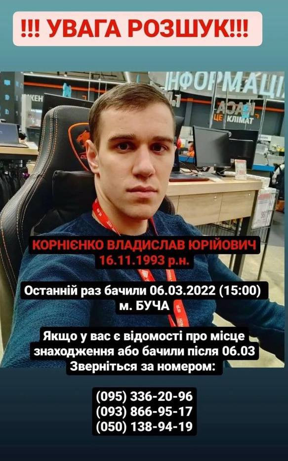 6 березня в м. Буча (Київська область) російськими військовими був затриманий Владислав Корнієнко, 1993 р. н. З розповіді його приятеля відомо, що 6 березня чоловіки вийшли зі сховища за продуктами харчування і дорогою їх зупинили російські військові. Чоловіка відпустили, а Владислава затримали. Місцеперебування чоловіка невідоме.