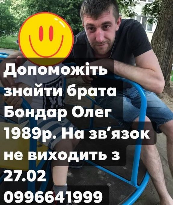 27 лютого безвісти зник Олег Бондар, 1989 р. н. Рідні припускають, що з високою ймовірністю чоловіка затримали російські військові в селі Сидоровичі (Вишгородський район, Київська область).