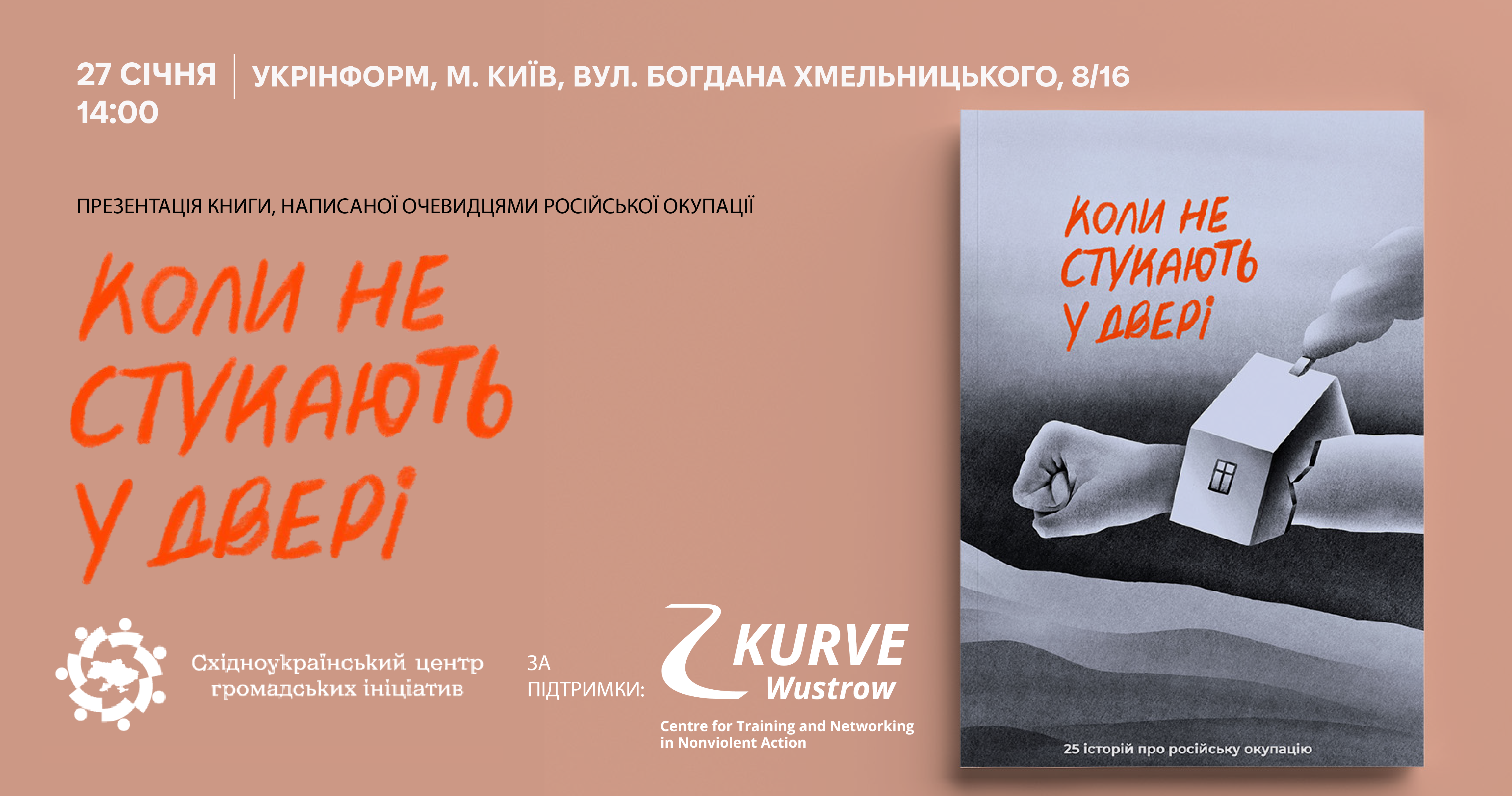 27 січня 2025 о 14:00 в прес-центрі Укрінформ (м.Київ, вул. Б. Хмельницького, 8/16) Громадська організація «Східноукраїнський центр громадських ініціатив»презентує книгу «Коли не стукають у двері: 25 історій про російську окупацію» написану очевидцями подій з 9 областей України.