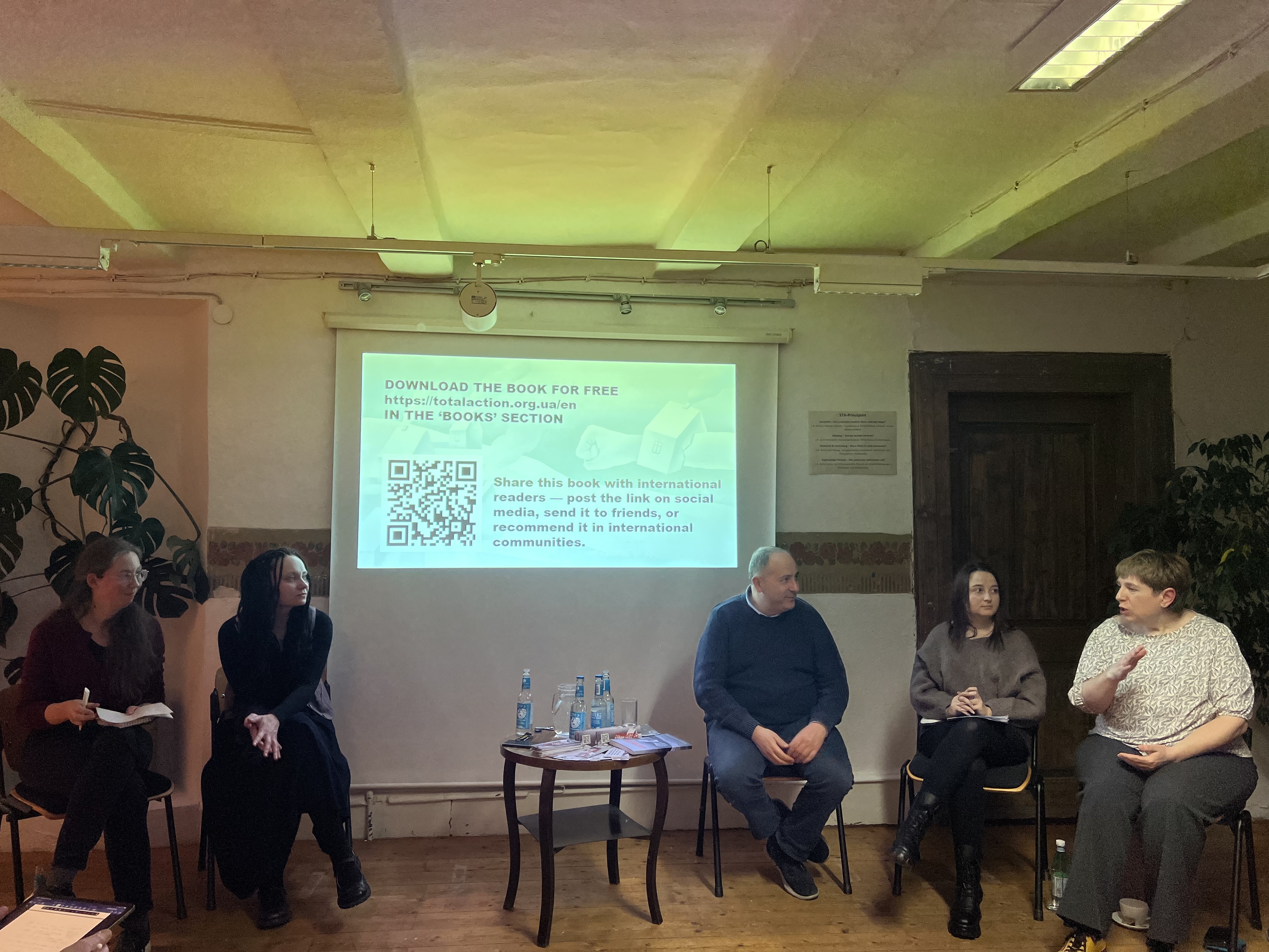 Одна з презентацій відбулася в Берліні під час дискусійної платформи Kyiv Cafe — регулярного майданчика для розмов про Україну, війну та європейську безпеку, який збирає дипломатів, експертів, журналістів і представників громадянського суспільства. Інша зустріч пройшла в містечку Вустров у приміщенні миротворчої організації KURVE Wustrow, що багато років працює у сфері ненасильницької трансформації конфліктів. Третю презентацію прийняла берлінська незалежна книгарня Buchbund Bookstore - культурний простір у районі Нойкельн, де регулярно відбуваються літературні читання та політичні дискусії.